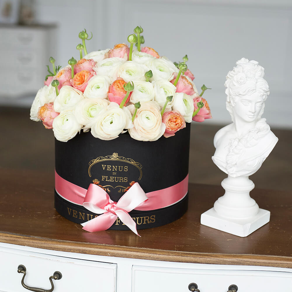 Цветы в шляпной коробке навсегда останутся классикой и альтернативой букетам.