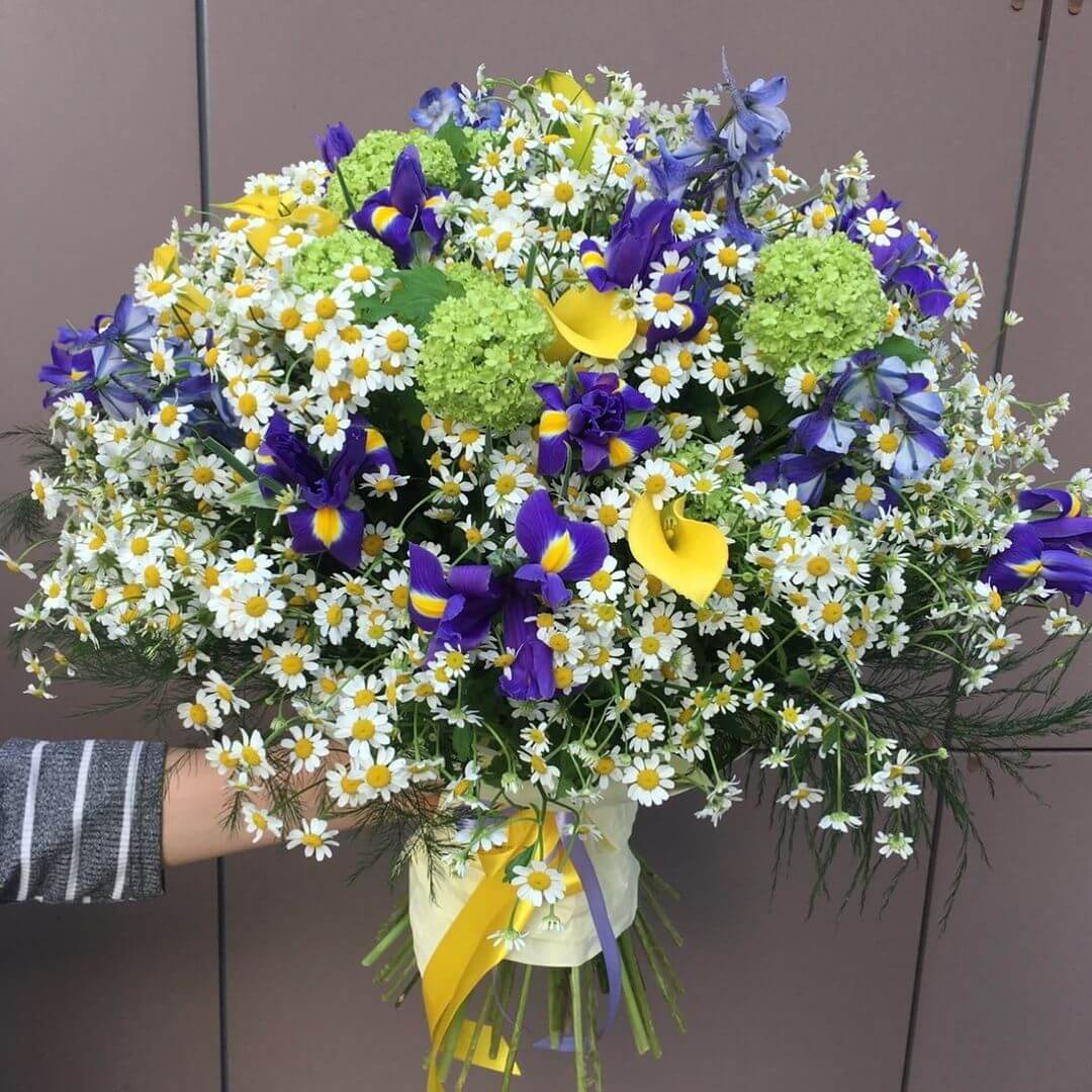 • 20 ирисов, 25 ромашек, 5 калл, 1 гортензия