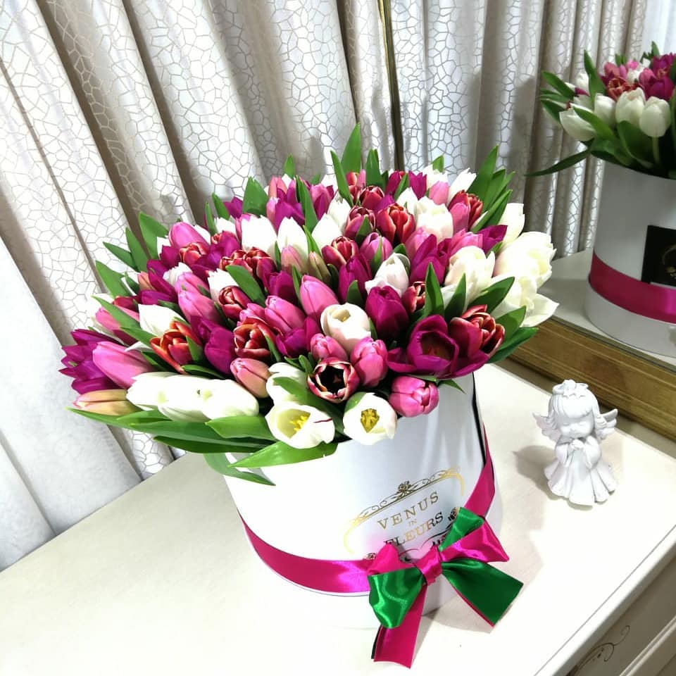 На данной странице Вы можете купить Розово-фиолетовый микс из тюльпанов в коробке - 101 шт.
