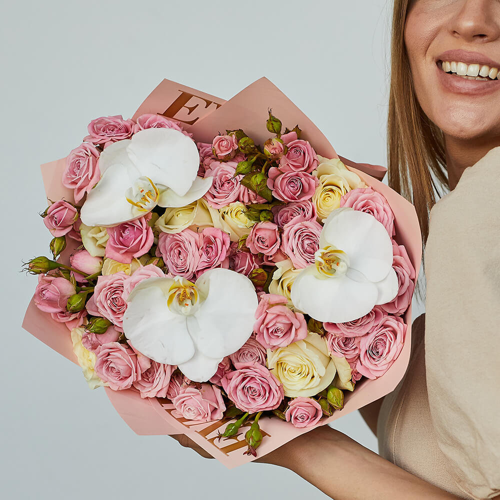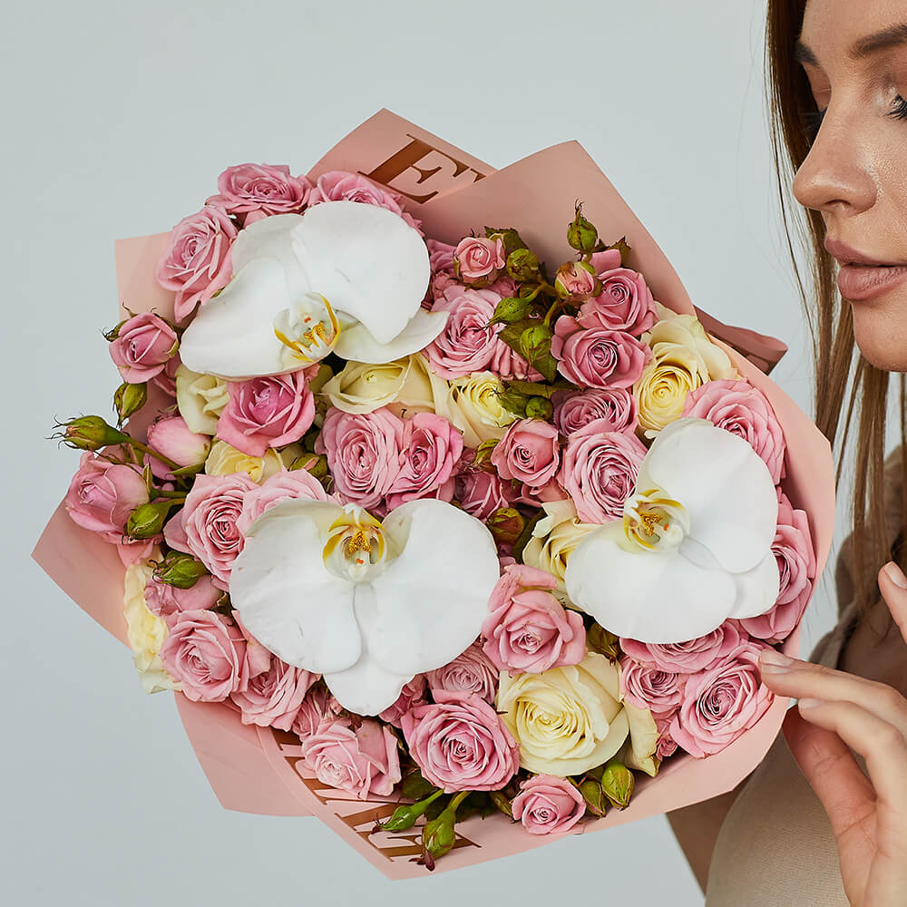 • 8 кустовых роз, 7 роз, орхидеи