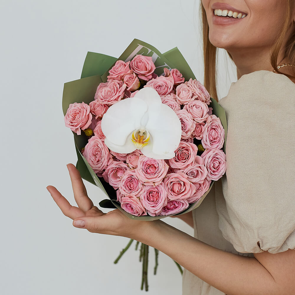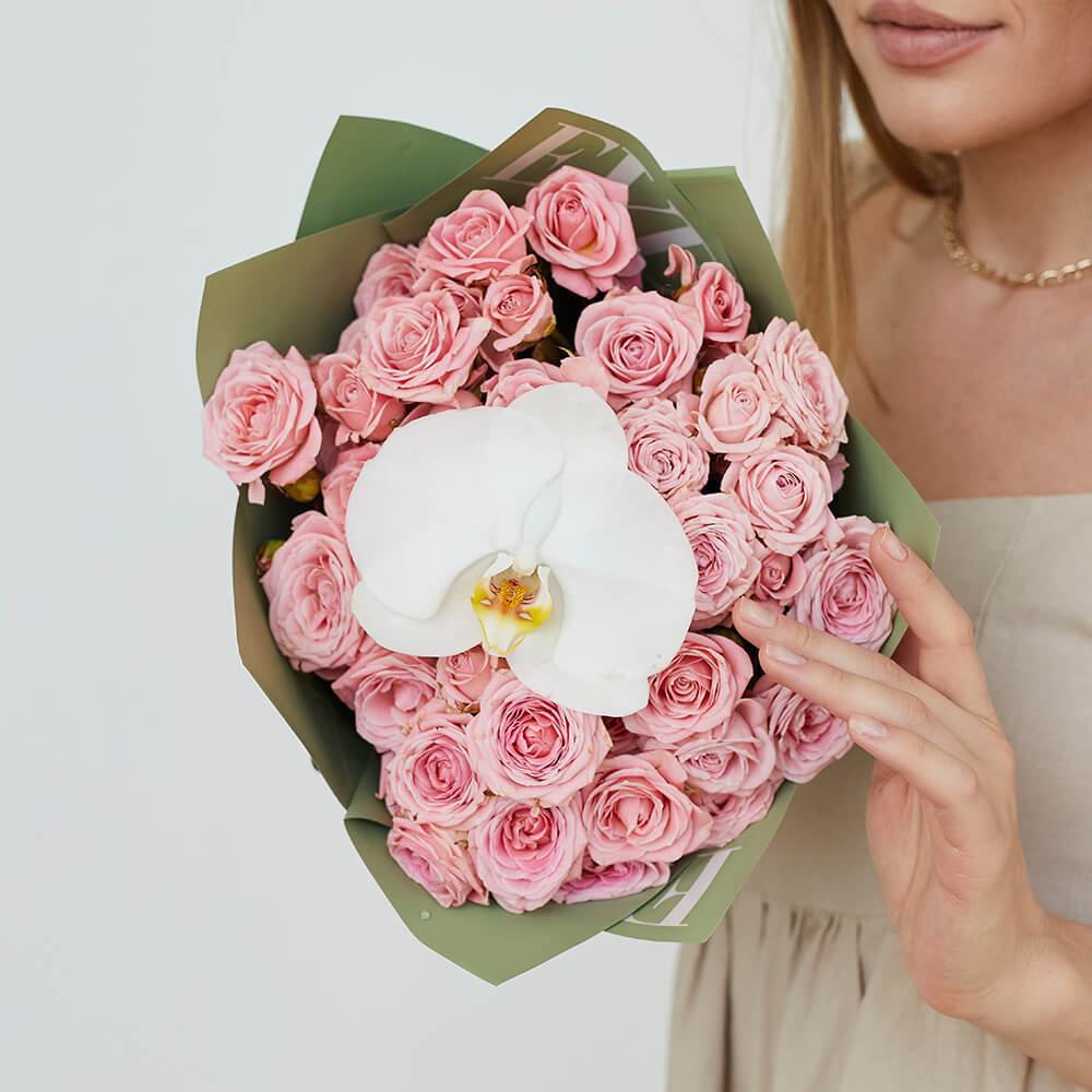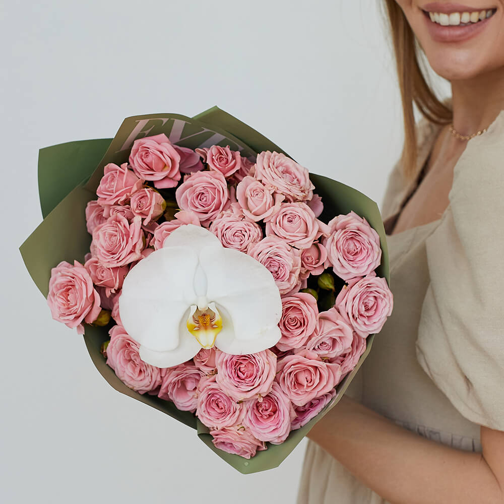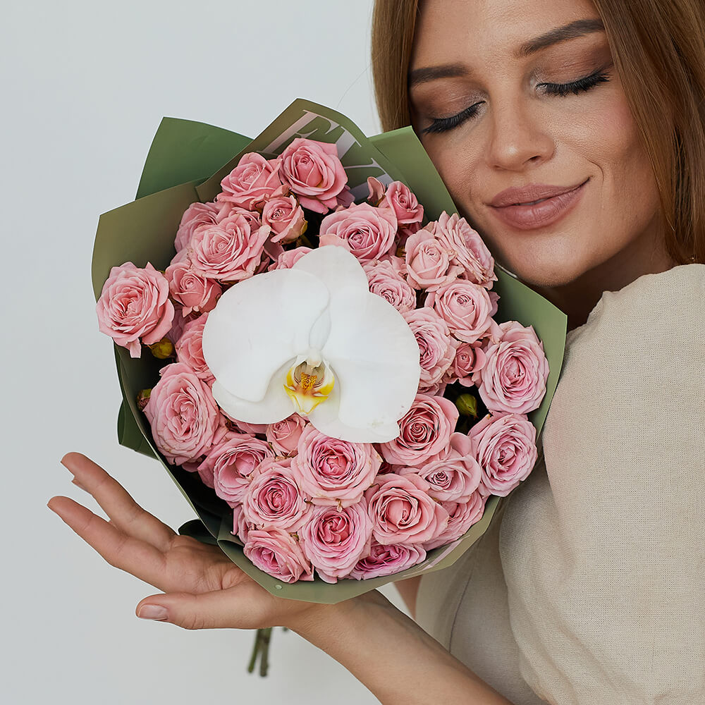 • 9 кустовых роз, орхидеи