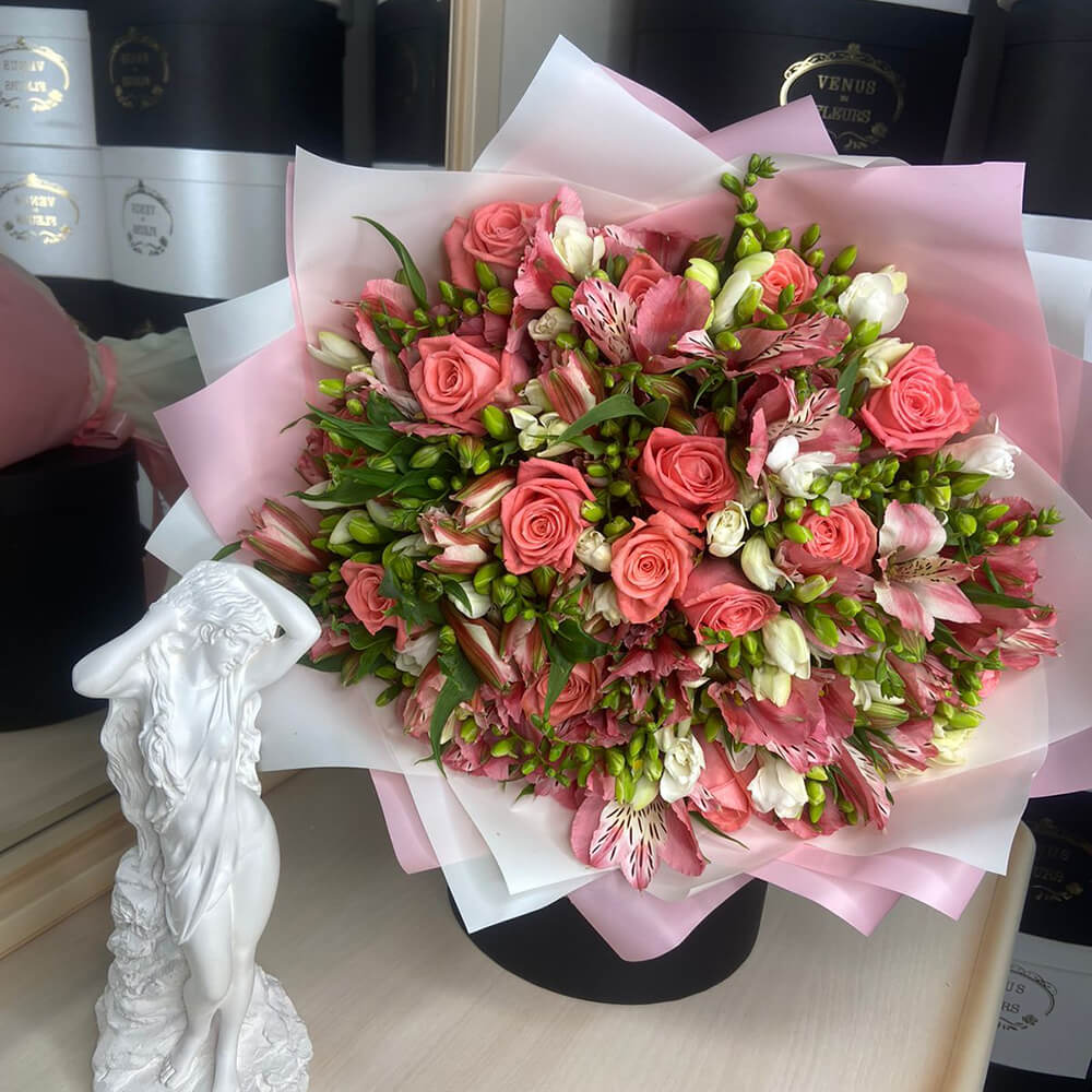 Цветы мы закупаем каждое утро, чтобы они оставались максимально свежими, именно поэтому они Вас будут радовать на протяжении от 7 до 14 дней.