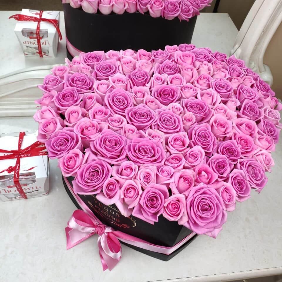 При виде роз в коробке в форме сердца Ваша любимая испытает настоящий восторг и только самые яркие эмоции. Удивите ее необыкновенным подарком.