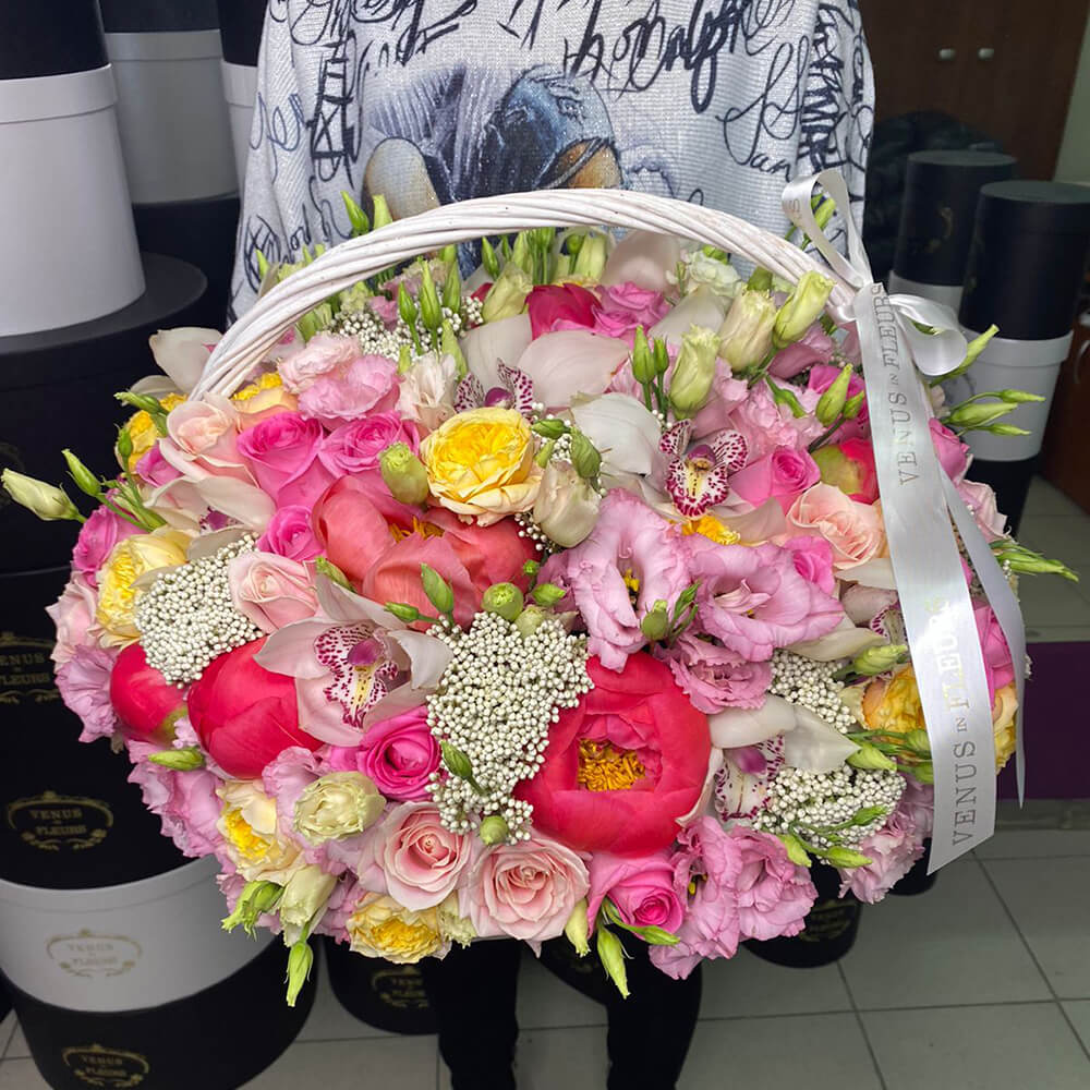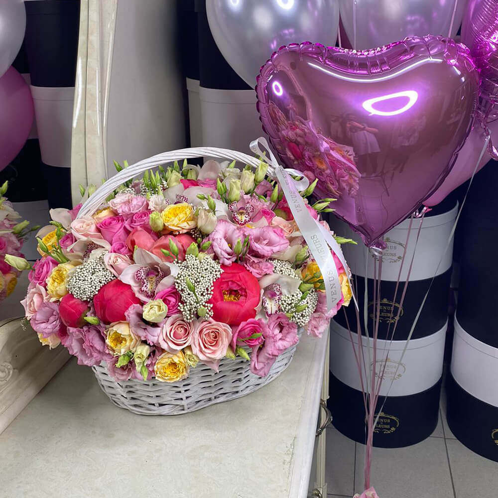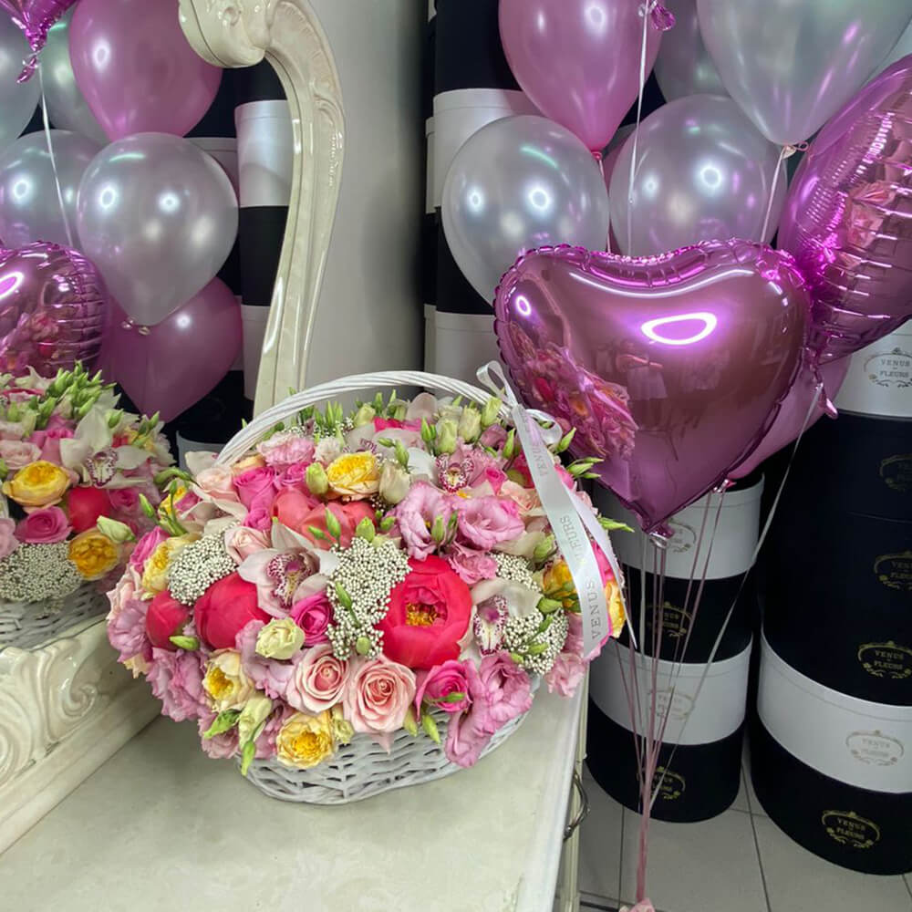 Это очень нежная и душевная композиция - цветы в корзине. Такой подарок точно станет центром внимания на любом торжестве.