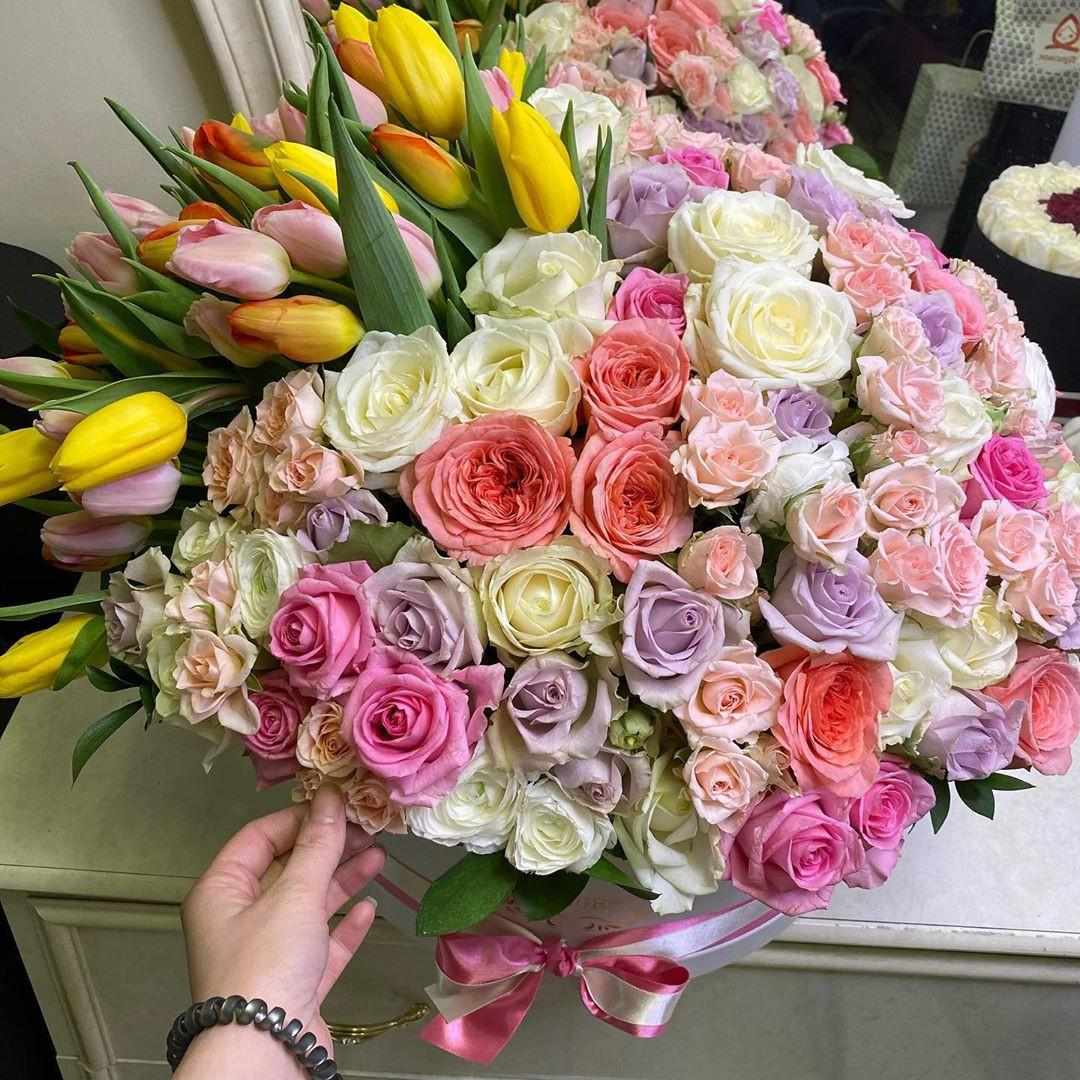 Невероятно красивый букет сочетает в себе и розы, и тюльпаны. Эта композиция привлекает не только сочетанием цветов, но и своими яркими красками!