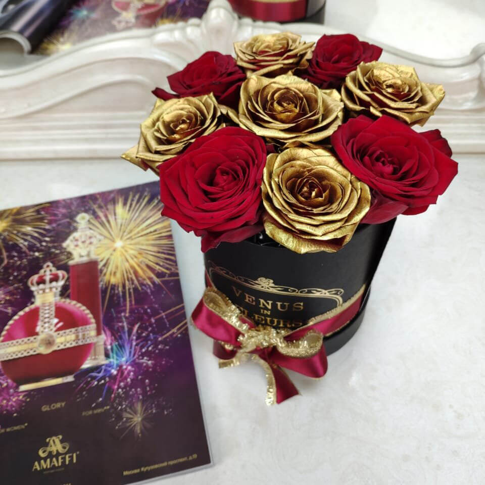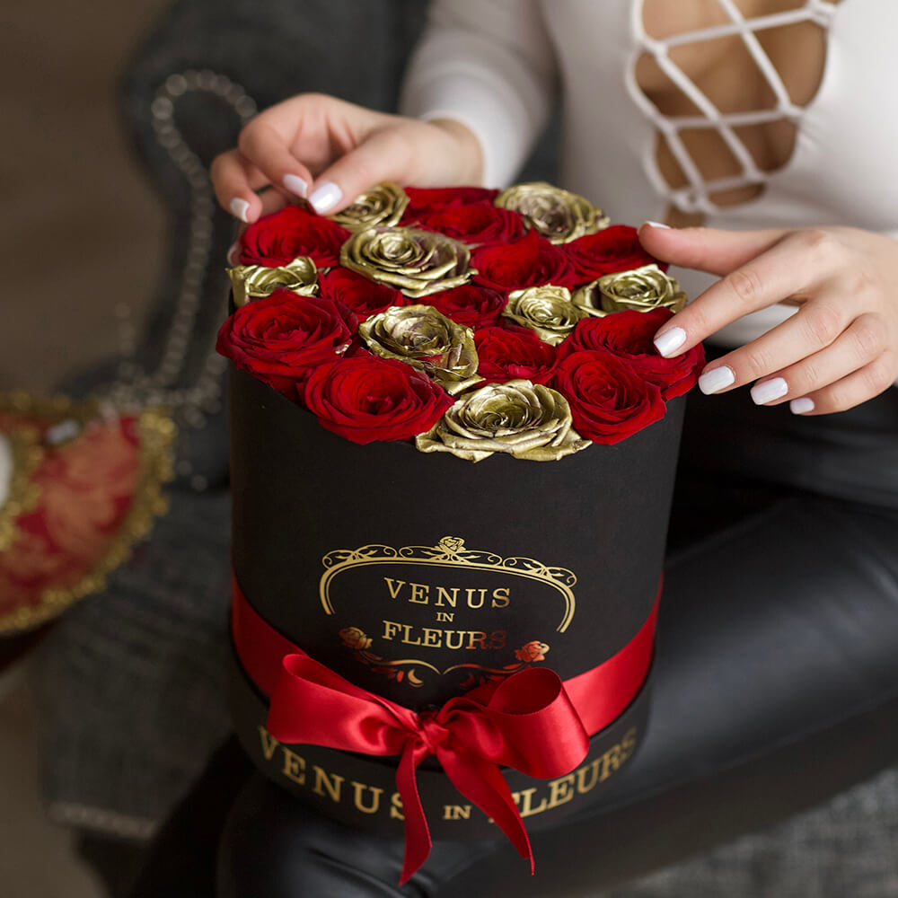 • черная коробка ручной работы, атласные ленты, флористическая губка