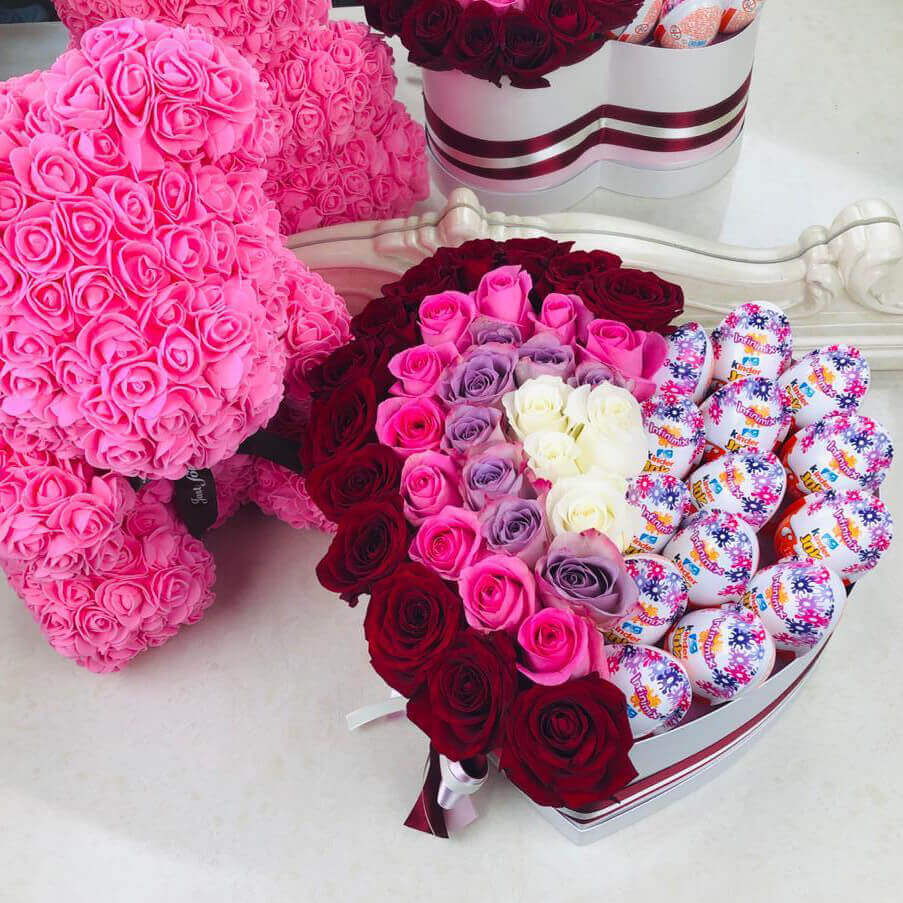 Подсластите жизнь своим любимым и сделайте подарок из киндеров и нежных роз в коробке в форме сердца. Ваша любимая удивиться подаренному чуду, с удовольствием полакомится вкусным шоколадом. Аналогов такого букета нет.