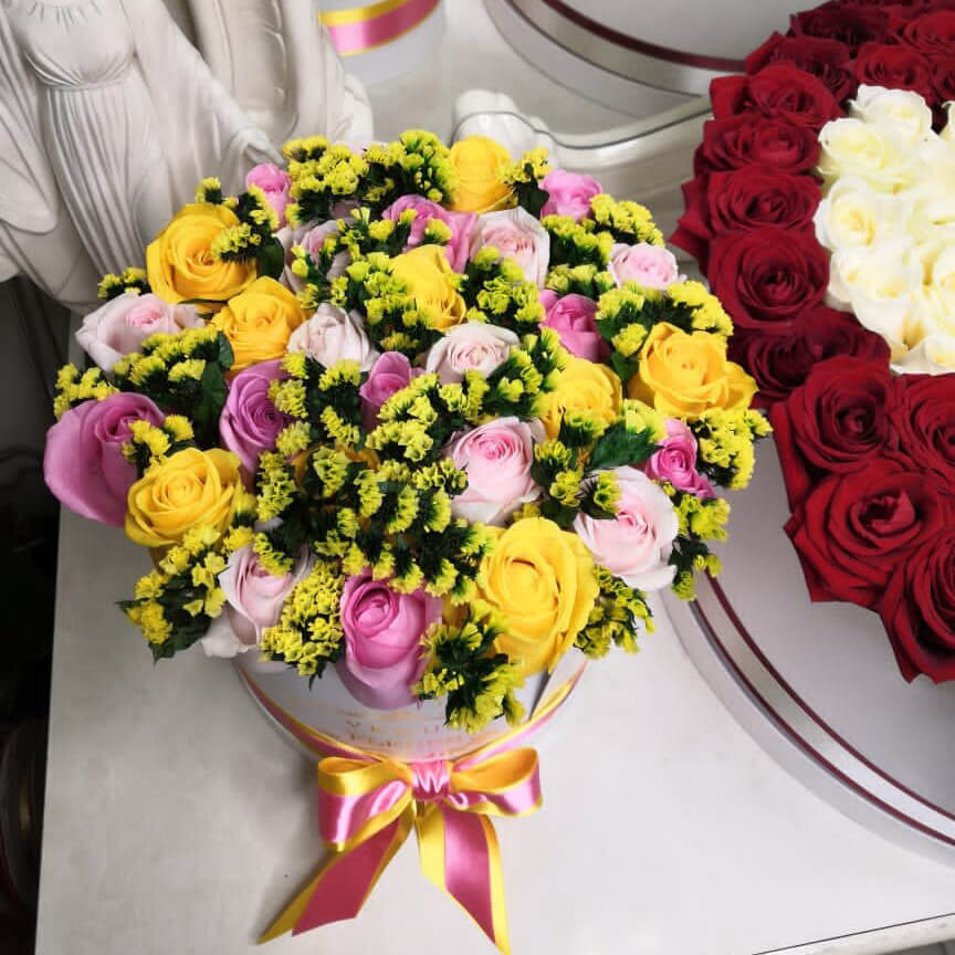 • белая коробка ручной работы, атласные ленты, флористическая губка