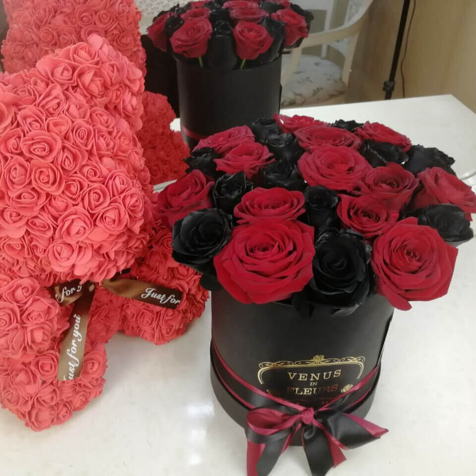 Роз черного цвета в природе не существует. Для их производства мы используем живые цветы и только высококачественную флористическую краску без запаха из Германии. Она гипоаллергенна, не пачкается и не осыпается. Ароматизируем розы легким цветочным парфюмом.