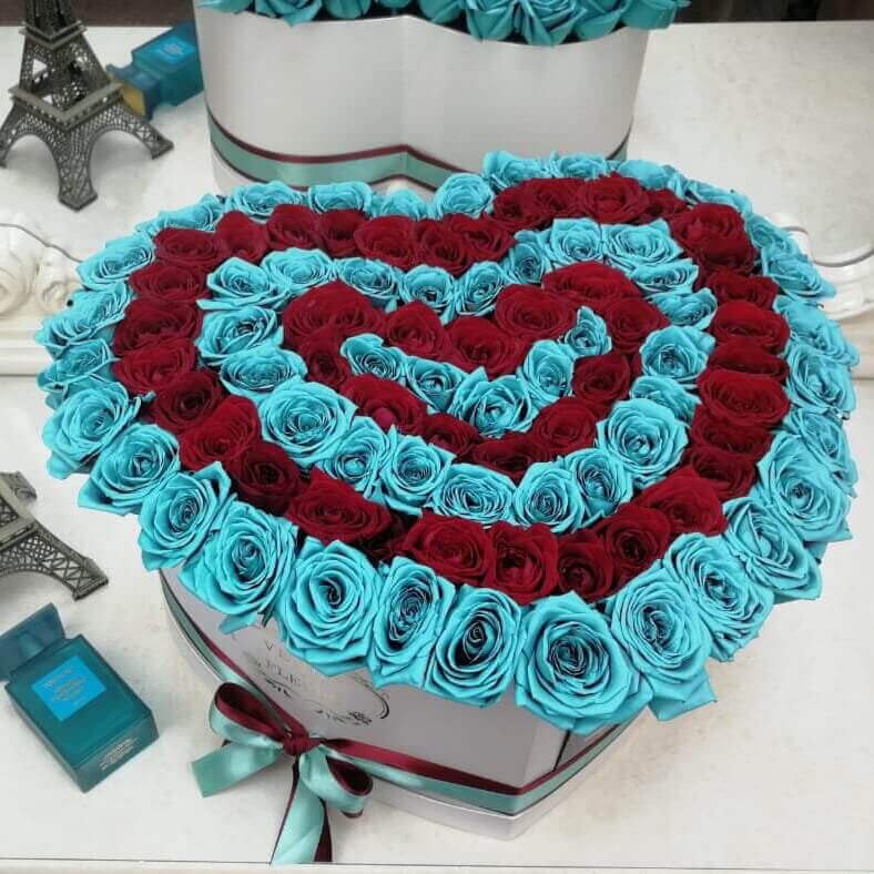 Шикарное сочетание бирюзового и красного цветов в букете. Невероятно красивое сердце не оставит равнодушной любимую. Этот шикарный букет лучше вас расскажет о ваших искренних чувствах!