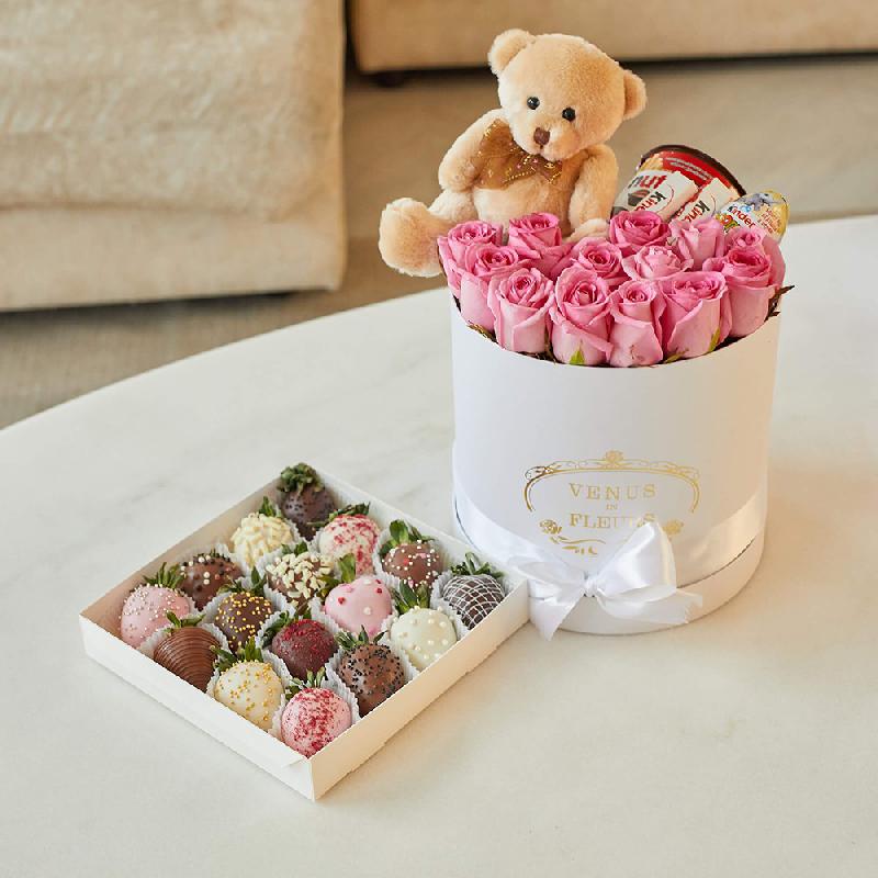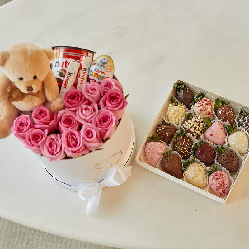 • 11 роз, 1 шт Nutella, 1шт Kinder Сюрприз, и Kinder Chocolate (4 шт), 1 мишка;