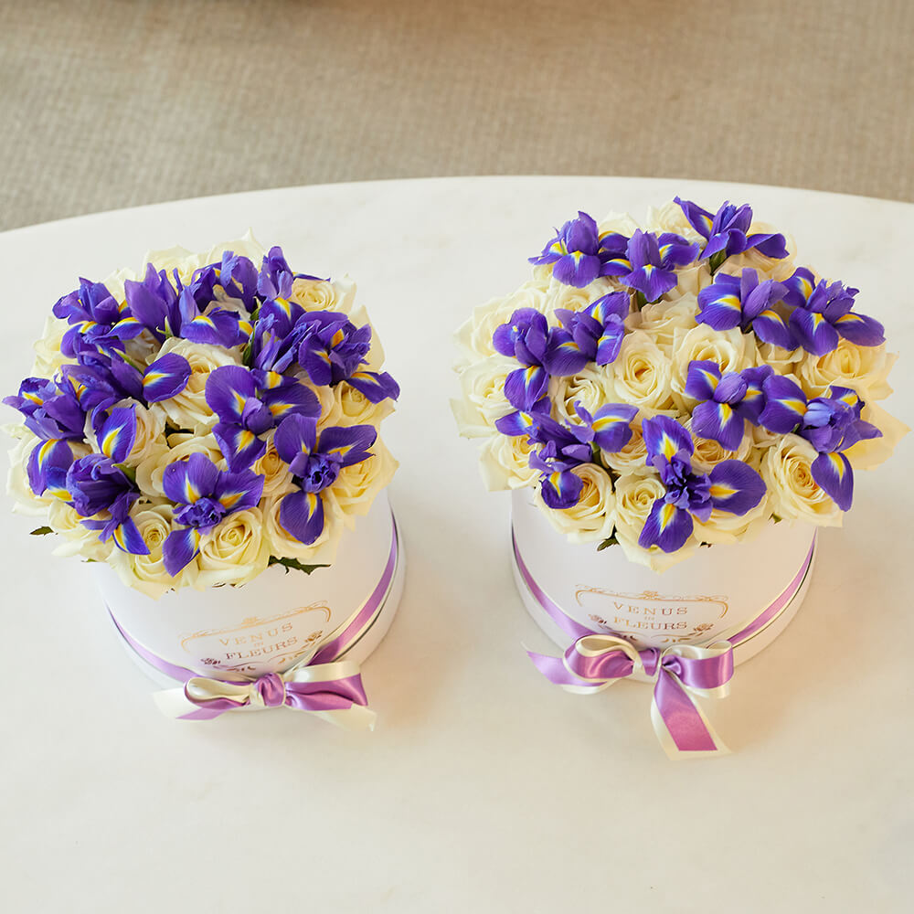 • 1-ая коробка - 20 роз, 11 ирисов;