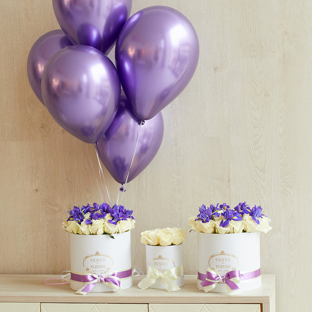 • 1-ая коробка - 20 роз, 11 ирисов;