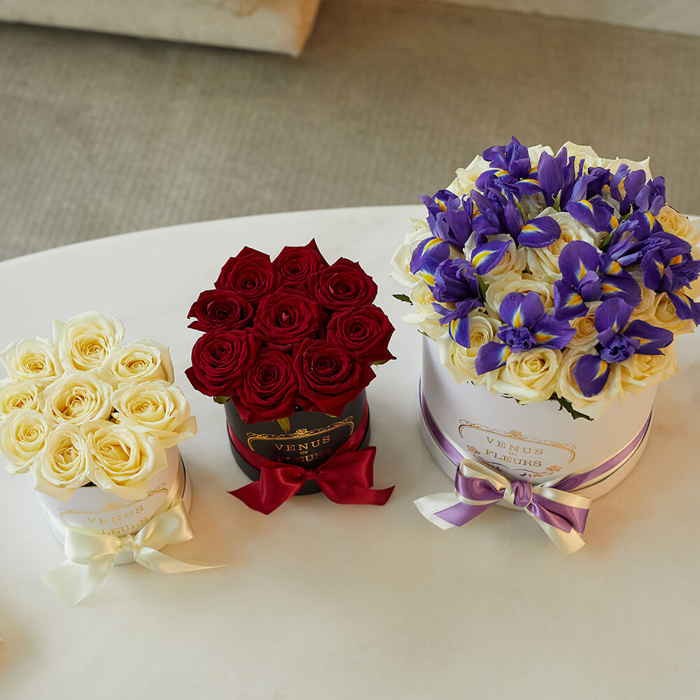 • 1-ая коробка - 20 роз, 11 ирисов;