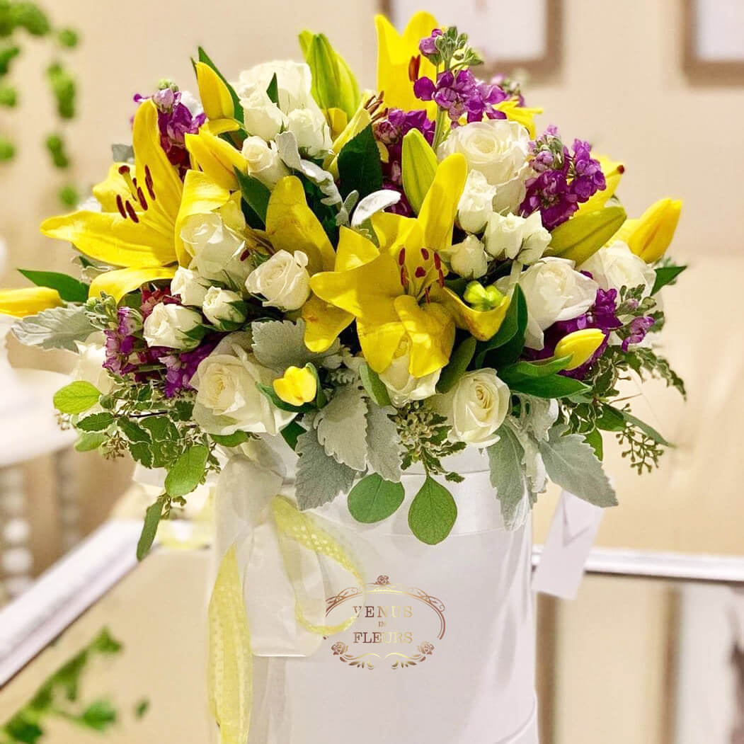 • 10 лилий, 10 кустовых роз, 11 роз, 10 маттиол, зелень