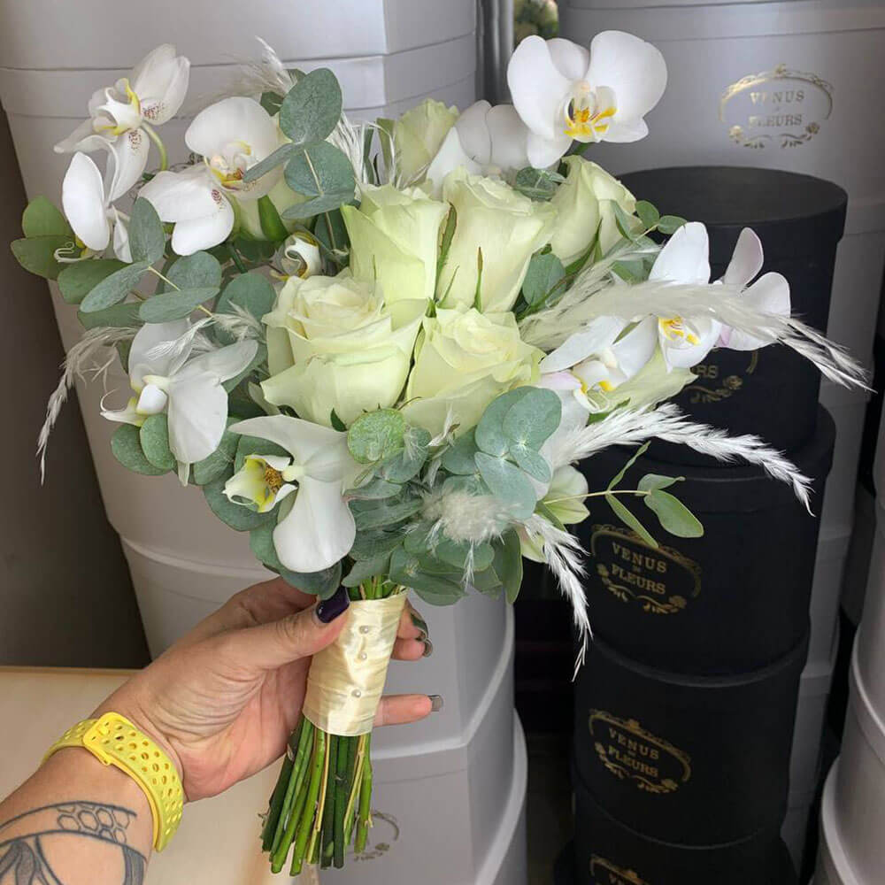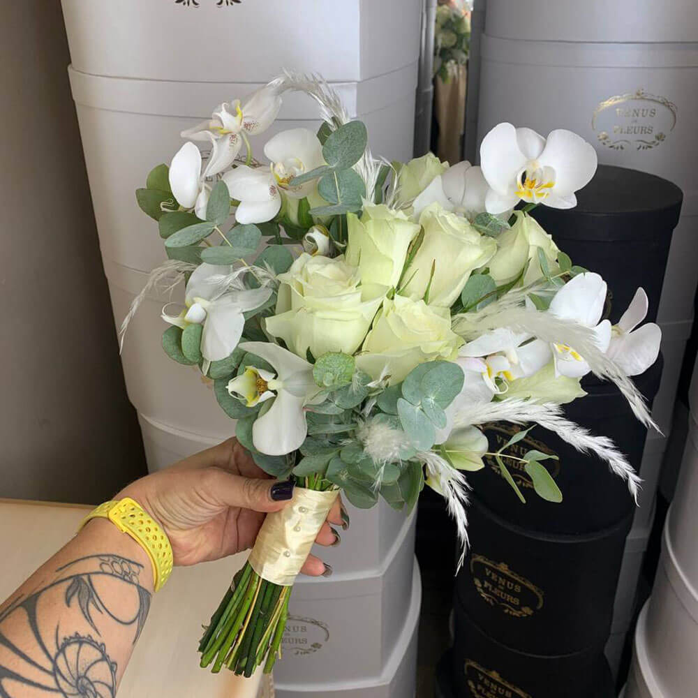 Незабываемая фотосессия с женихом не может обойтись без очаровательного свадебного букета, который будет завершать Ваш прекрасный образ. Гости и друзья обязательно обратят внимание на этот нежный свадебный букет, который станет отличным дополнением к образу королевы бала, богини красоты.