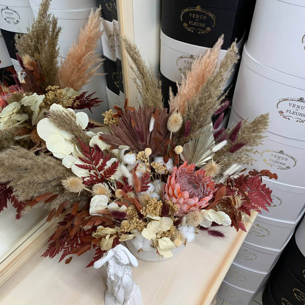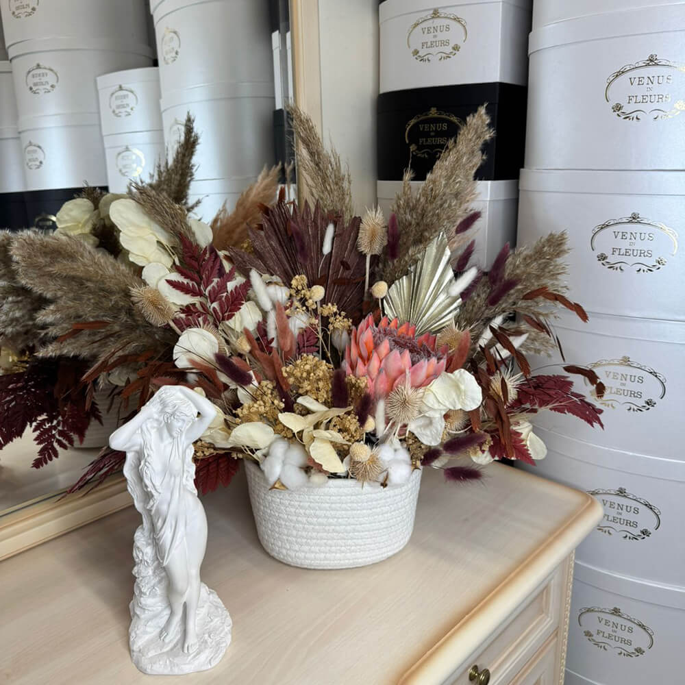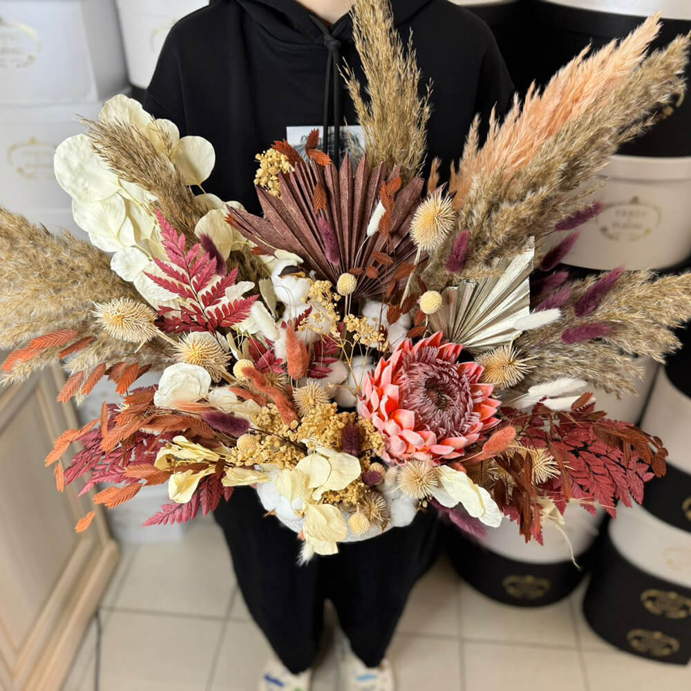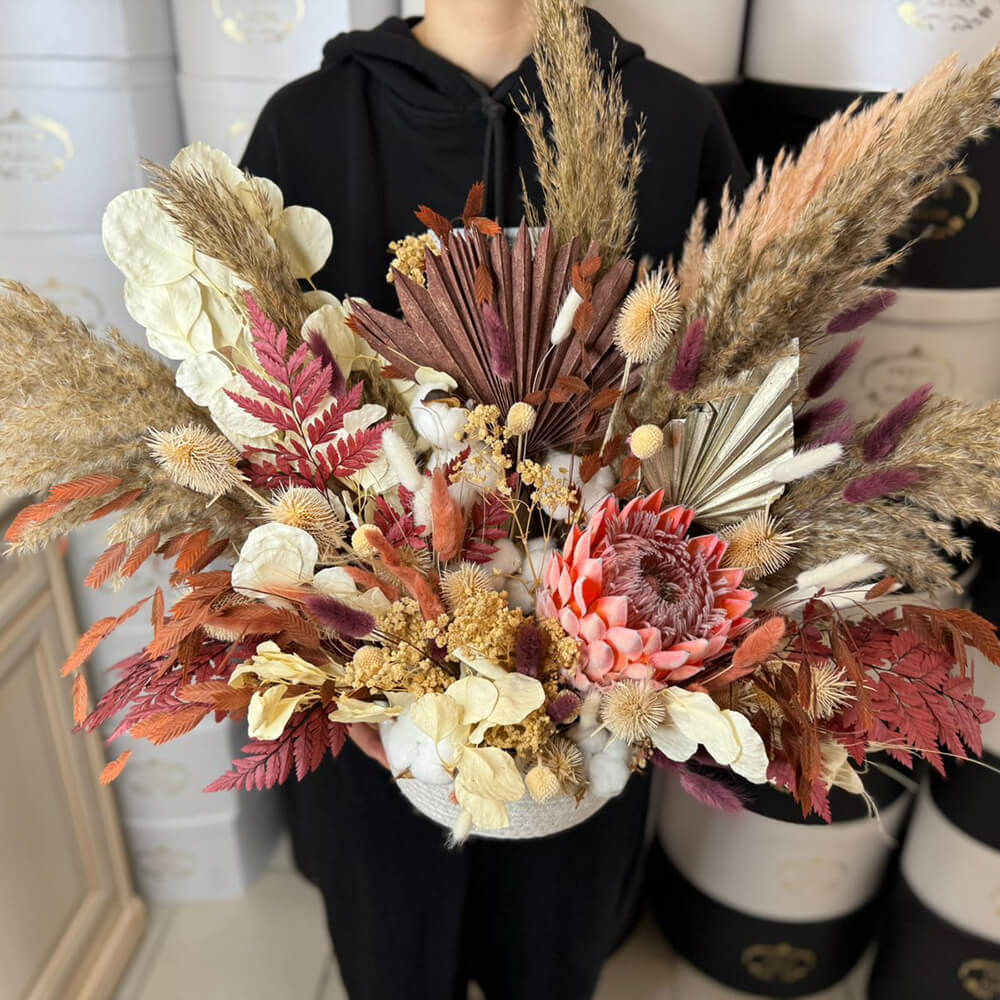 - Протея, лист пальмы - 2шт, ворсянка, камыш, кортадерия, лагурус, папоротник, стабилизированный Авена, эвкалипт, хлопок - 9 шт., ,краспедия 10 шт,г ипсофила сухая.