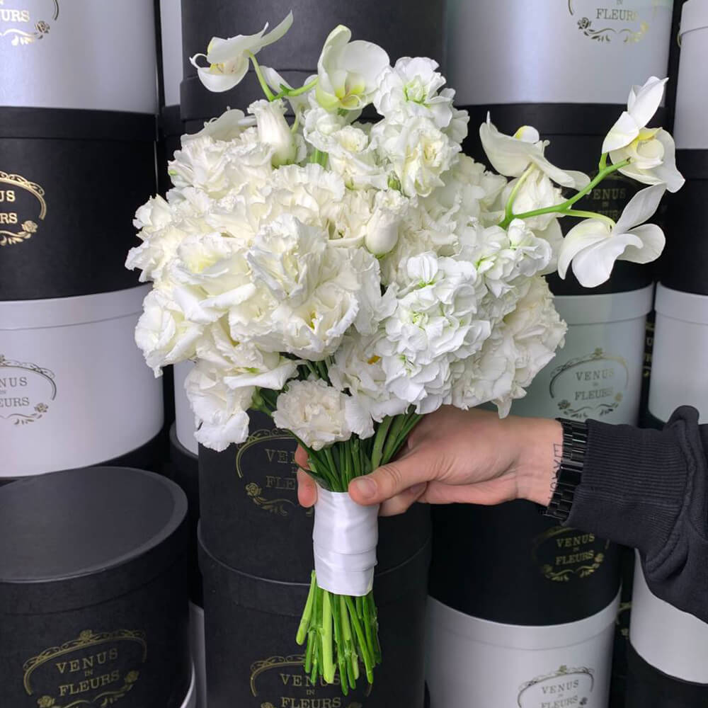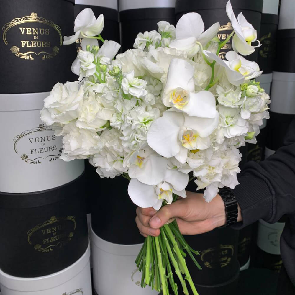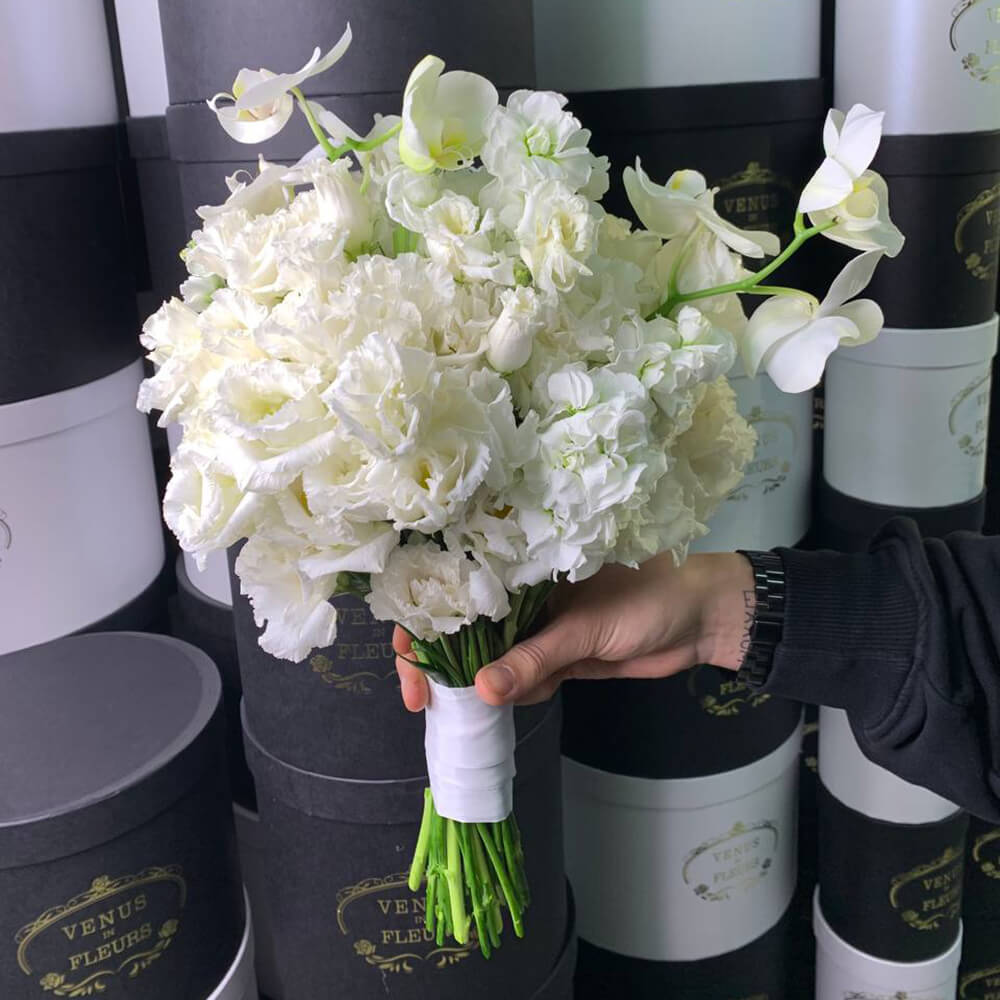 • 10 эустом, 5 маттиол, 2 стрелы фаленопсиса (примерно 10 орхидей)