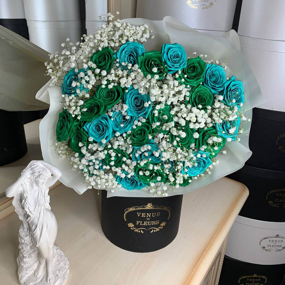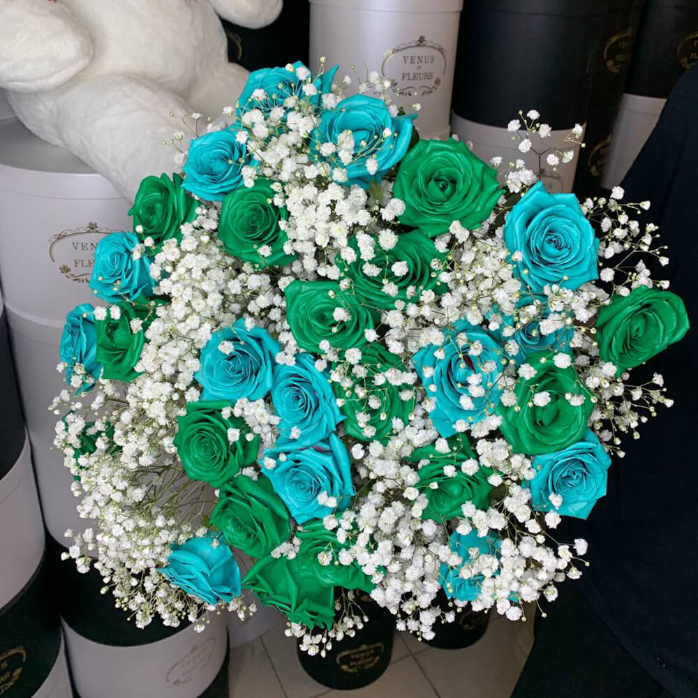 Роз такого цвета в природе не существует. Для их производства мы используем живые цветы и только высококачественную флористическую краску без запаха из Германии. Она гипоаллергенна, не пачкается и не осыпается. Ароматизируем розы легким цветочным парфюмом.