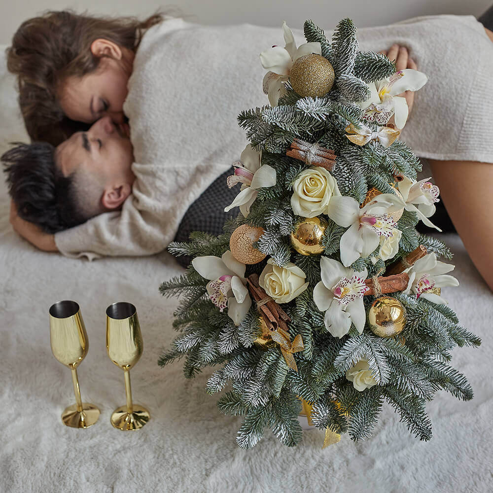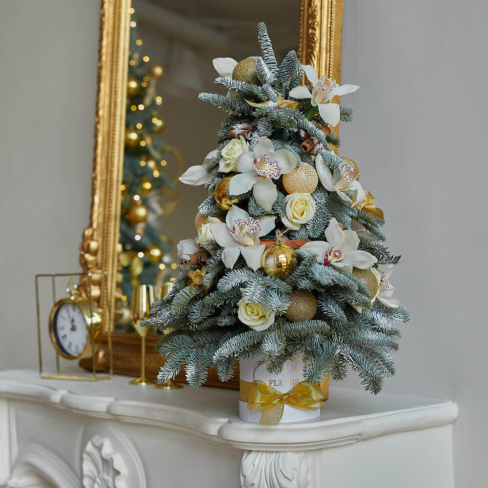 Новогодняя ёлка с белыми розами в коробке - это отличный подарок на Новый год, который восхитит своей красотой, необычностью и элегантностью.