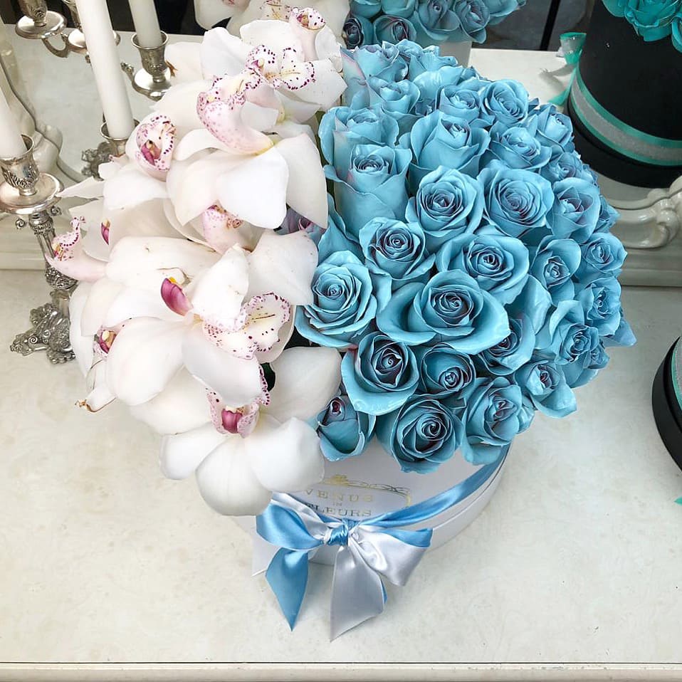 Этот необычный небесный цвет роз олицетворяет чистоту души и свободу выбора. А прекрасные орхидеи добавляют нежности в эту композицию. Ваша вторая половинка будет в восторге от подаренного букета.