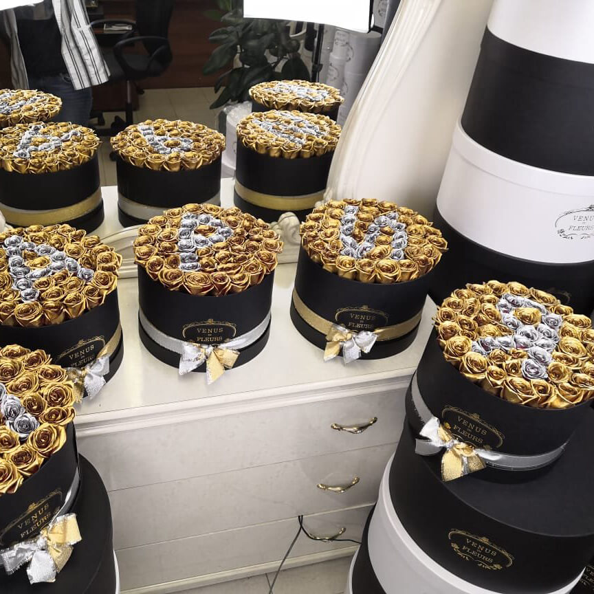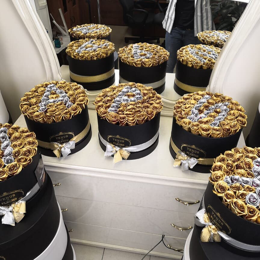 • черная коробка ручной работы, атласные ленты, флористическая губка